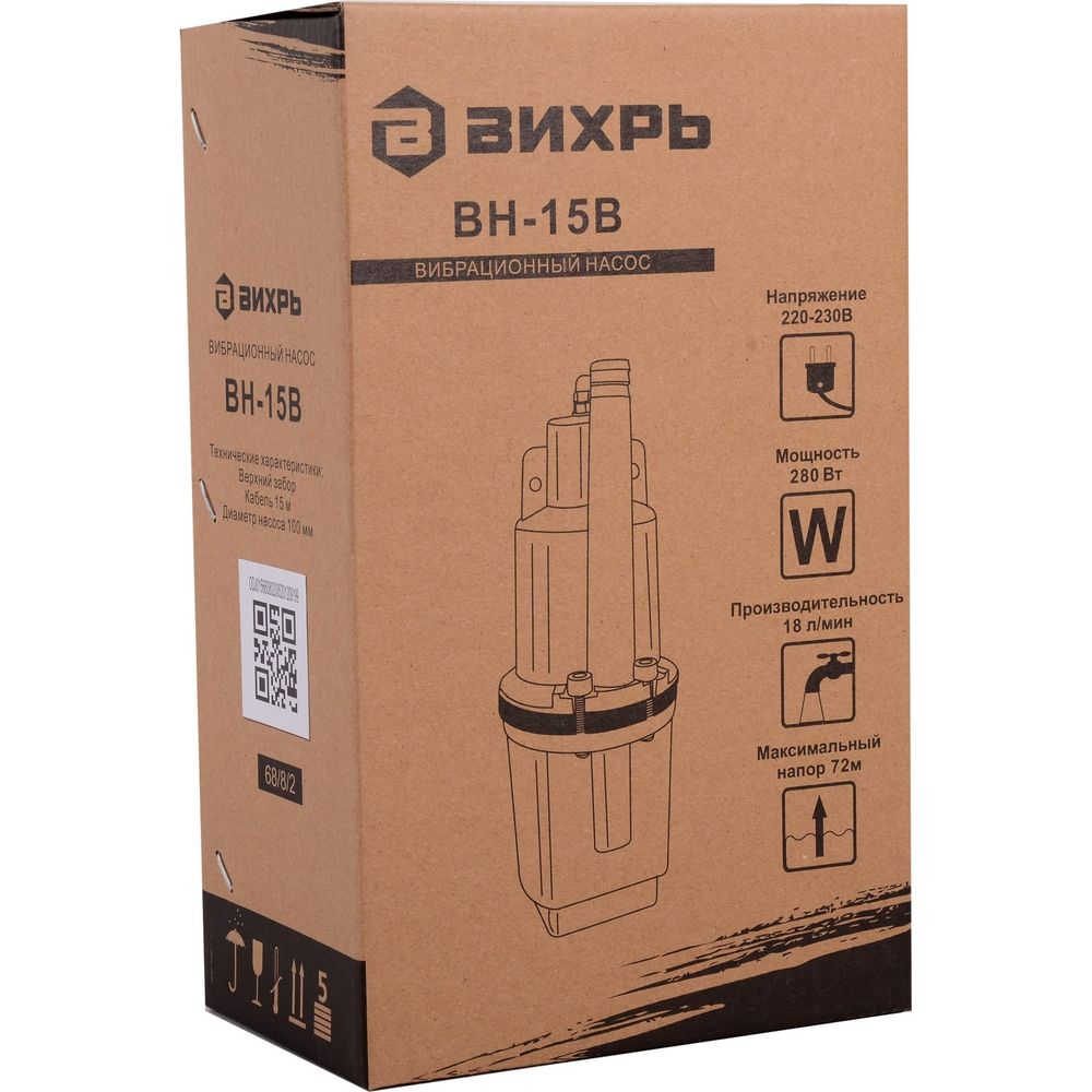 Модель вибрационного насоса с верхним типом водозабора модели Вихрь ВН-15В широко применяется в бытовых системах автономного водоснабжения. Модель потребляет минимум электроэнергии, имеет простую конструкцию, не требует технического обслуживания и недорого стоит. Полезная мощность насоса – 280 Вт. Производительность при напоре 40 м составляет 8 л/мин. Глубина погружения до 3 м. Диаметр конструкции – 100 мм. Вибрационный насос этой модели может применяться для забора воды из скважин, колодцев или ёмкостей. Может использоваться также для обеспечения водозабора из открытых водоёмов с целью полива дачных участков. При этом массовая доля механических примесей должна быть не выше 0.01%