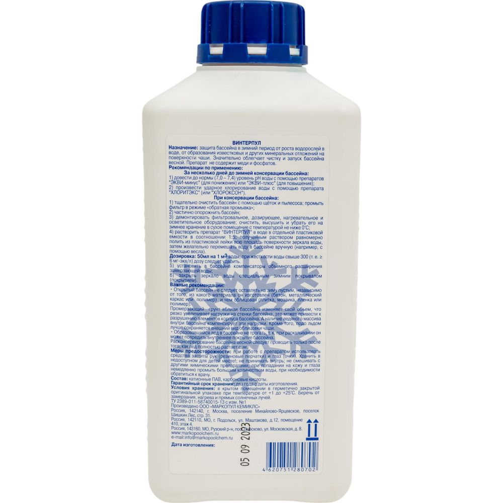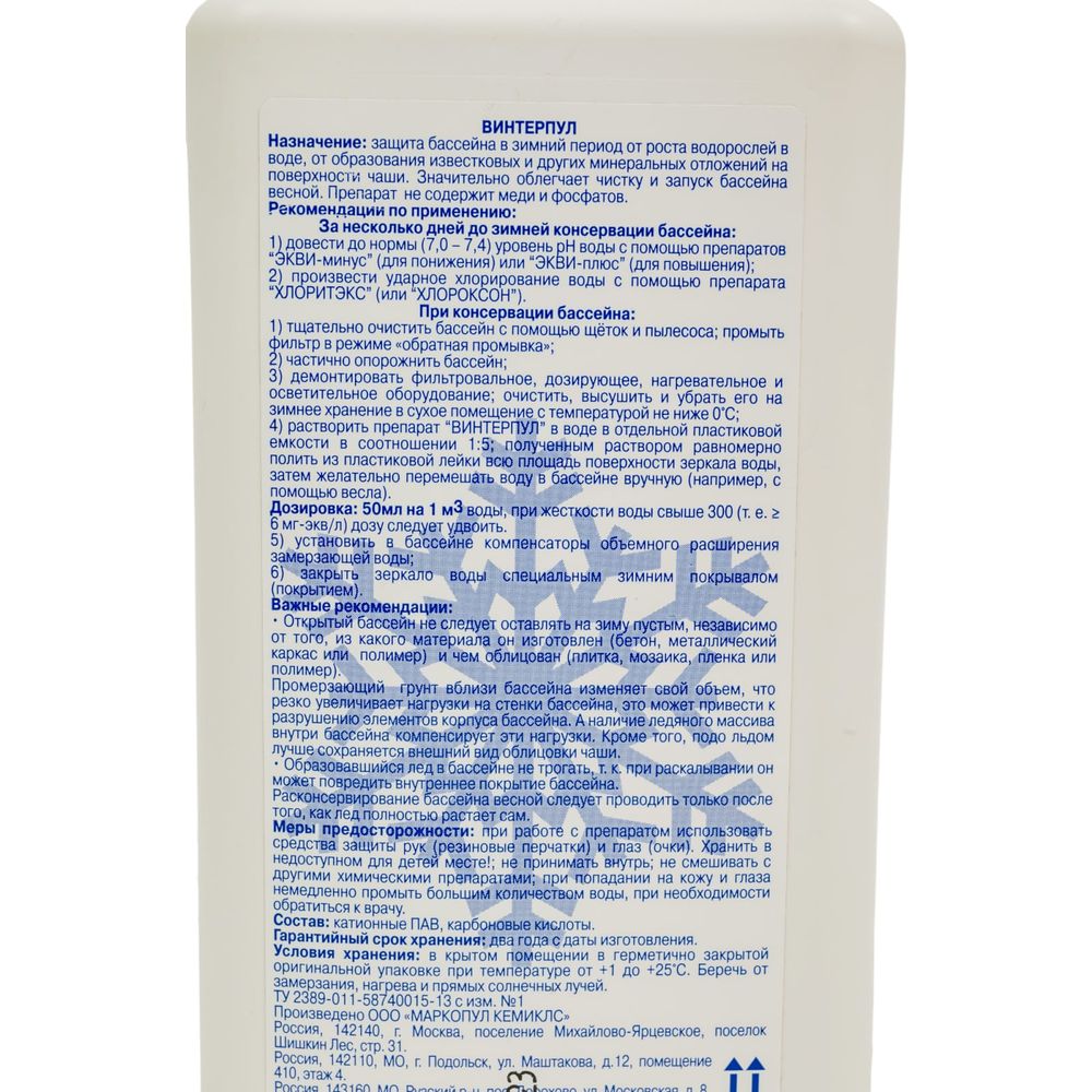 Винтерпул МАРКОПУЛ КЕМИКЛС 1 л М12 - жидкость для консервации открытых плавательных бассейнов на зиму. Защищает от роста водорослей и образования различных отложений на поверхности чаши. Облегает запуск бассейна весной. Препарат содержит органические кислоты и ЧАС.